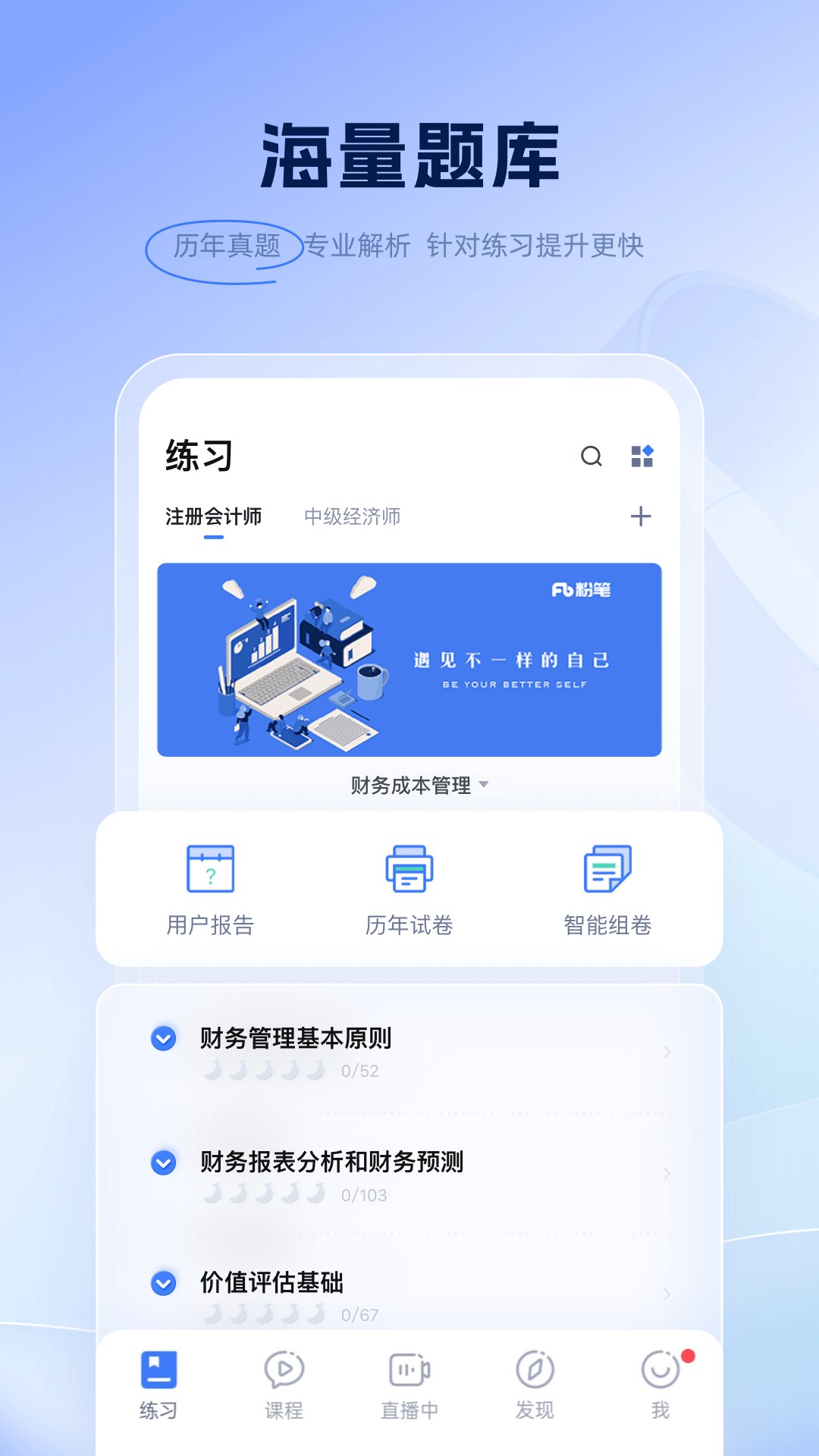 我们正在努力尝试,希望通过粉笔会计APP的平台实现财会类职业教育优质教学资源的共享,让每一位财会类考生都能获得到优秀师资的课程和专业的题库。同时,粉笔会计APP也是一款更智能,更高效的财会类学习工具,听课与做题一站式满足,助力轻松备考,取证。