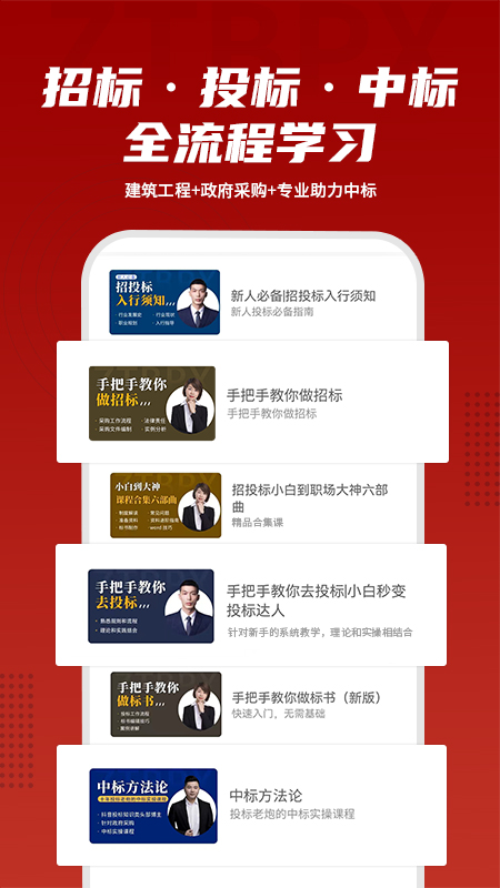 招投标培训APP立足于招投标行业实用性需求,与多家教育培训机构和行业的专家、讲师建立合作,聚合了丰富的学习内容,包括招标百科、规范性文档、视频、文章等。全面覆盖常见行业,课程贴合实际工作需要,学习工作无缝对接,课程不断升级迭代,坚持手把手式教学模式。