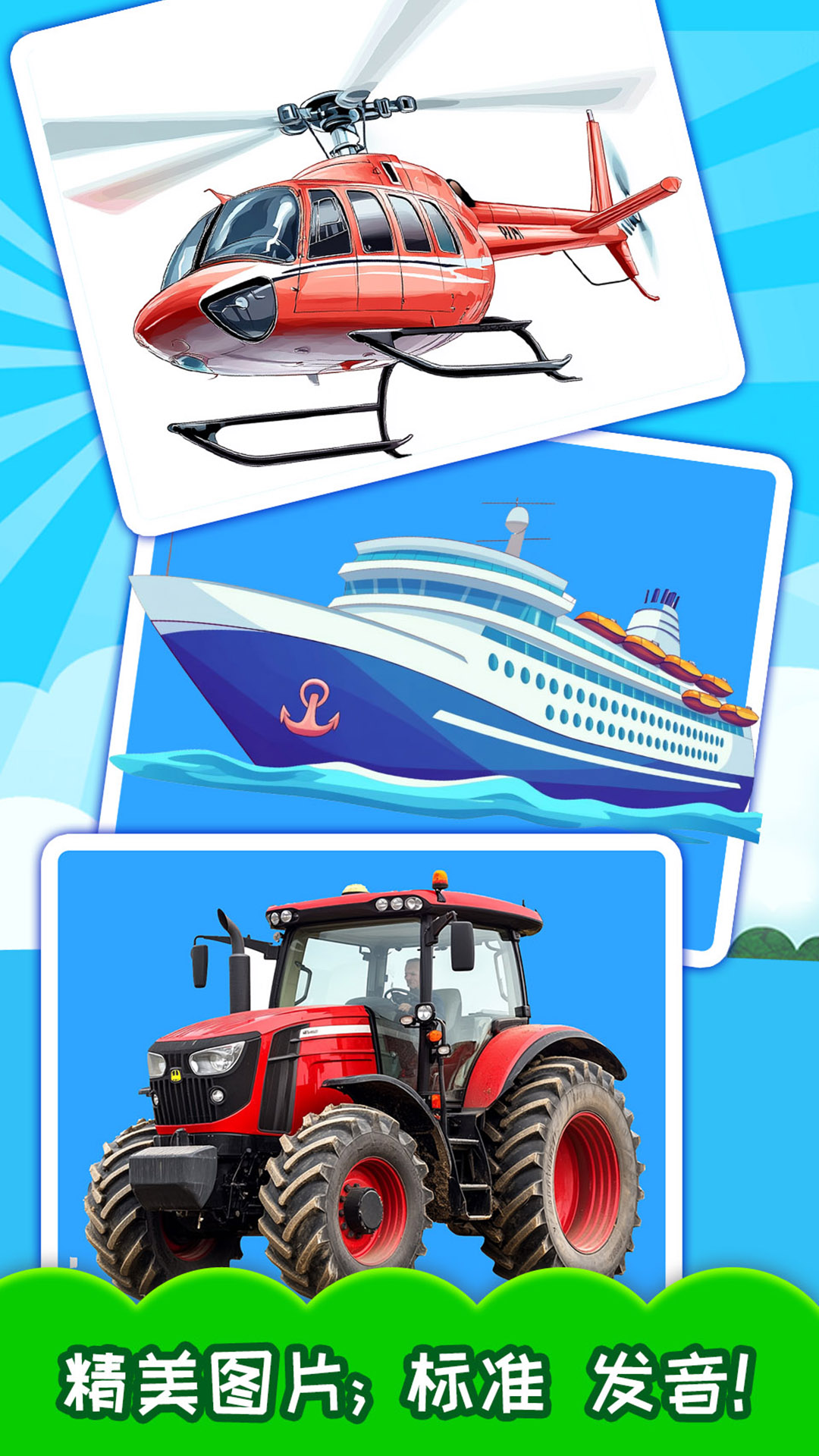 安卓版下载 大小:43.51MB 下载:3256次 宝宝交通工具认知 4.3fg 支 持:安卓系统 分 类:安卓赚钱 大 小:43.51MB 版 本:4.3fg 评 分: 开发者:极速下载站 下载量:3256次 发 布:2026-03-28 00:47 手机扫码免费下载 #宝宝交通工具认知 4.3fg截图 #宝宝交通工具认知 4.3fg简介 有趣的交通工具学习App!这里精选陆地、海洋、天空的交通工具,采用图片、文字、动画相结合,配合朗朗上口的童谣、精彩的介绍、标准普通话跟读,让孩子认知交通工具,学习交通工具相关知识。App特点:1、丰富的海陆空交通工具; 2、结合中文、英文、交通工具介绍、童谣,寓教于乐; 3、“考考乐”模块,根据听到的名字,选取正确的图片。巩固学习到的知识。 软件厂商:广州拓辰信息技术有限公司 开发者及隐私协议 使用权限 应用权限 防止手机休眠查看网络连接拥有完全的网络访问权限