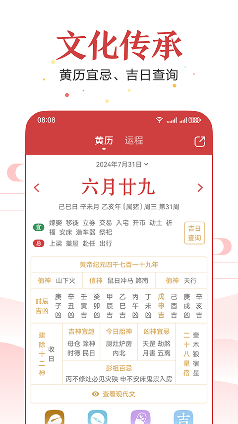 6、想知道今天的财神喜神方位吗?轻点手机,打开万年历,转动罗盘即可知道。