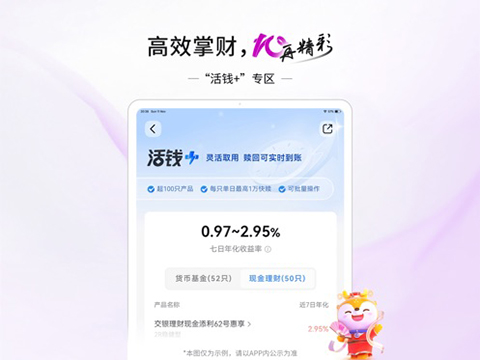 2、"活钱+"专区:超100只快赎产品可供选择,灵活取用、快速到账。