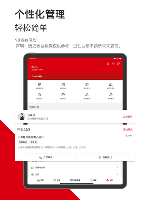 通过个性化界面管理借记卡和信用卡,轻松使用存款、转账、外汇、理财、信用卡等多项银行服务。