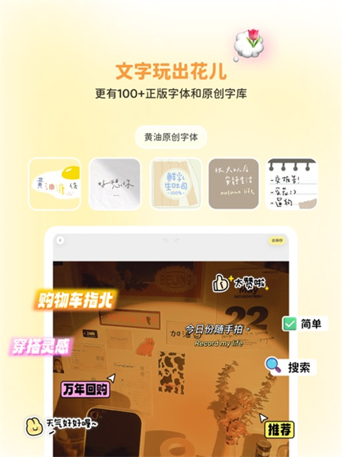 诸多主题图形,让你的照片锦上添花。强大的编辑功能,调色、剪裁、加字美化一气呵成。更有字体描边、字体背景、镂空特效等诸多新功能等你挖掘。