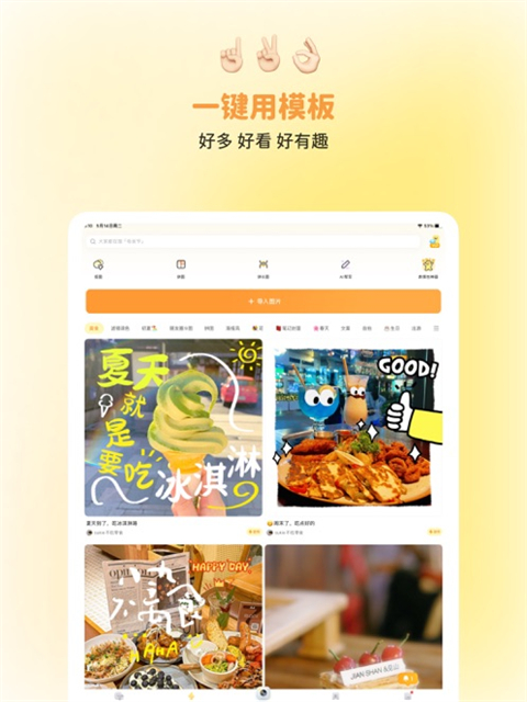 黄油相机ipad版是一款趣味的照片美化应用。虽说软件名称叫黄油相机,但是实际使用起来却一点也不油腻,甚至整体风格还有点小清新。黄油相机ipad版一直致力于为用户打造最好用的拍照加字工具,软件最大的特点就是可以为用户拍摄的照片添加文字信息,经过简单的处理之后,可以让照片看起来像专业的海报一样精美。除了添加文字外,用户还可以给照片添加背景、图形贴纸等等,制作好的照片还可以设置成手机壁纸哦!如果你厌倦了网上千篇一律的手机壁纸,那不妨尝试下自己设置个性划的手机壁纸吧,这样可以让你更加与众不同。