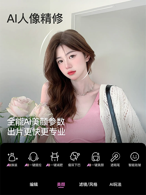 一键减肥、一键增肌、去双下巴、画质提升、AI换背景、AI消除、AI一键美颜、AI头发等专业精修参数告别繁琐,一键出片!
