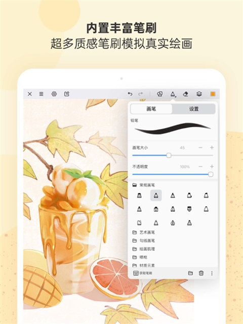 1、拥有多种仿生画笔,可以模拟真实手绘效果,同时支持自定义笔刷