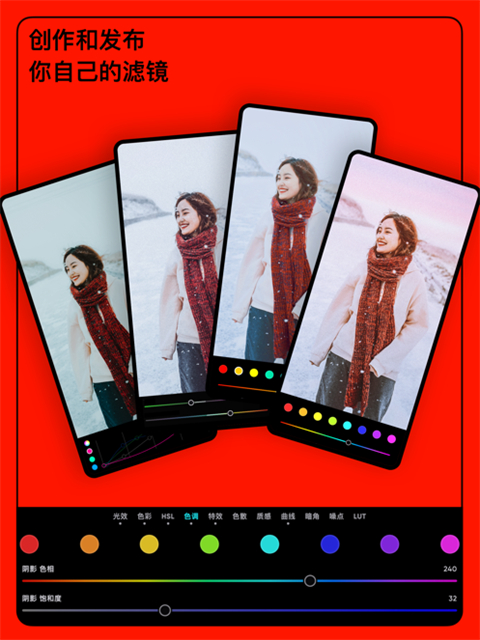 • 全局调整:光效,色彩,HSL,曲线,光感,质感,特效,偏移,染色,色调,色散,暗角,噪点,LUT