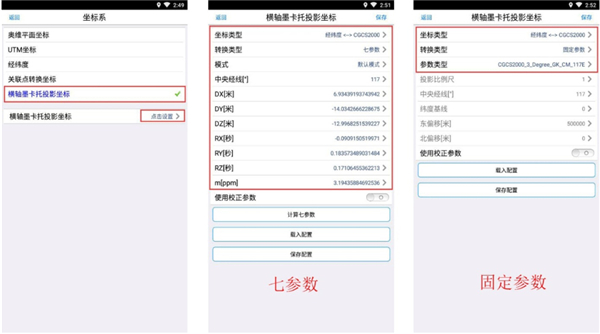 进入[坐标系]页面,选择【横轴墨卡托投影坐标】,点击设置,设置坐标类型、转换类型以及相关参数。