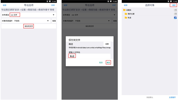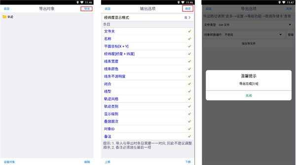 进入[导出对象]页面,点击【导出】,设置经纬度格式以及条目,点击【确定】。