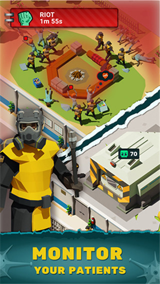 僵尸医院大亨是一款以僵尸治疗为主题设定全新模拟经营类养成游戏。游戏中其不仅拥有着整体简约高清的3D画风、场景、及人物等设计,提供了各种各样的僵尸群体、多样性的pk挑战、和更多的冒险活动等你参与,而且针对于玩法上,相比较于治疗普通病人经营游戏不大一样的是,如果在治愈过程中不给予僵尸足够的关注,安抚他们的情绪,提高病房的舒适度,并为他们提供一些可以消遣的项目,他们很有可能暴走咬伤医务人员,直接让这些花大价钱雇来的员工集体下线。故此在游戏中,玩家不仅需要从小型诊所开始,通过不断雇用人员,建造东西,为医护人员提供高质量的设备,比如为病房添置桌椅电视,安装马桶淋浴,升级通风系统等,扩大娱乐场所并装备指挥所,并竭尽所能将其转变为现代化的综合大楼,以应对世界上最危险的患者之外。你也还需要不断的与各个强大的丧尸进行游戏比拼,找到了对该病毒的治疗方法,治愈感染者并尝试避免爆发攻击。让他们最终不变成僵尸,为人类最终的希望不断的努力!