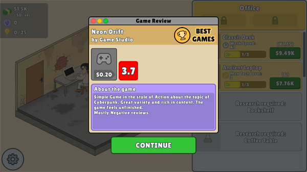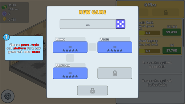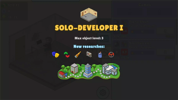 放置游戏开发模拟器(ldle Game Dev Simulator)是一款模拟经营游戏,玩家需要从零开始发展自己的游戏帝国——从简陋的车库开始,一桌一椅,一人一电脑,凭借自己的双手,给自己的人生绘彩,开发出自己的游戏,从而赚取利润,升级自己的办公室,招募优秀的员工,进而发展城真正的游戏巨头。放置游戏开发模拟器手机版内玩家需选择合适的游戏类型、热门的主题以及超高的技术水平开发出爆火的游戏,同时合理平衡资金,确保收益覆盖开发成本并支持后续项目,体验从零到巨头的成长历程。