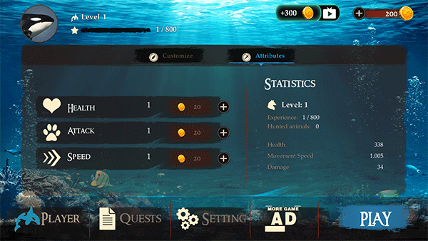 1、用金币能增加属性点,可以看到虎鲸的详细数据,点击play就可以开始游玩了