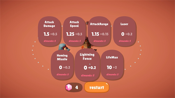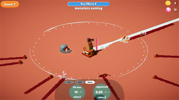 3、当敌人出现时炮塔会自动攻击,当敌人接近时就会破坏炮塔,炮塔被摧毁则游戏失败。