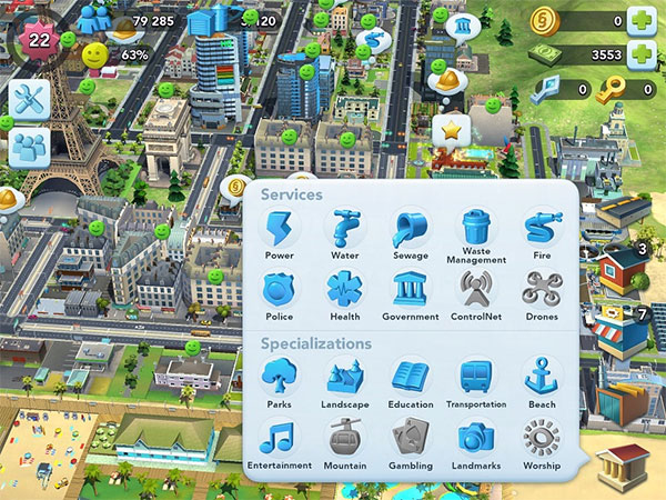 另外,游戏玩法十分自由,玩家就可以解锁解锁埃菲尔铁塔和自由女神像等专属地标,还可以探索全新技术,以及提供发电厂和警察局等社会服务。并且,随着城市规模越来越大,日趋复杂,玩家需要做出正确的决定,所以大家还在等什么,感兴趣的小伙伴赶快来下载体验。