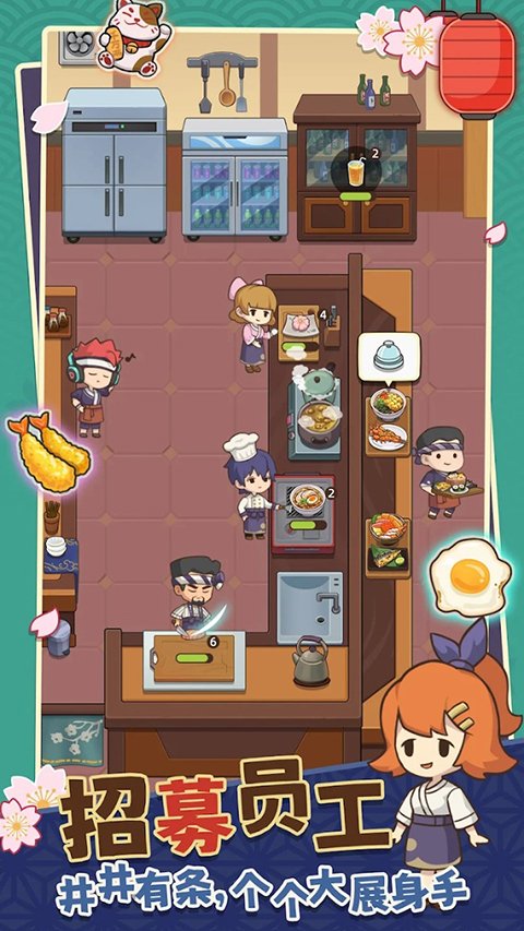 1、十分可爱的游戏画风,轻松风趣的放置玩法,去解锁多多寿司食谱